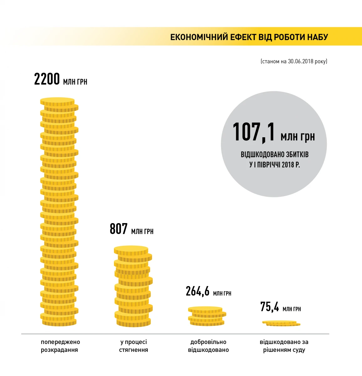 Директор НАБУ зазначив, що економічний ефект від роботи НАБУ перевищує 3 млрд грн. Із цієї суми за час роботи НАБУ за рішенням суду відшкодовано 75,4 млн грн, добровільно відшкодовано особами, викритими на корупції, 264,6 млн грн (із них понад 107 млн грн — у І півріччі 2018 року), у процесі стягнення перебувають 807 млн грн. Крім того, детективи запобігли розкраданню 2,2 млрд грн.