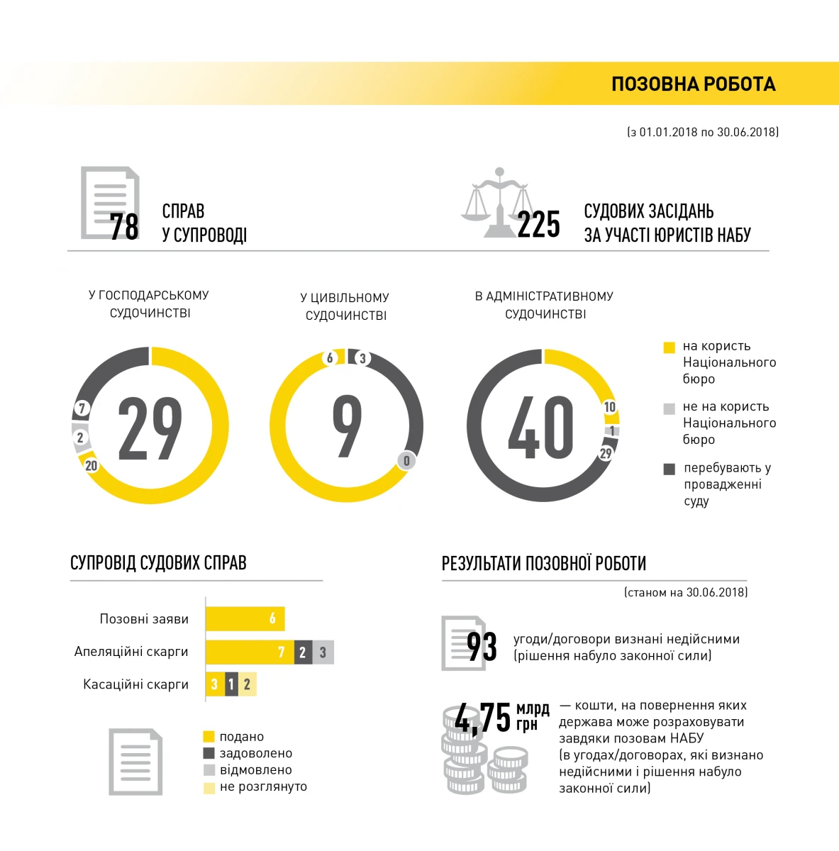 Загальна сума угод, які станом на 30 червня 2018 року НАБУ через суд вимагає визнати недійсними, становить 6 млрд грн. 80% від цих коштів містяться у договорах, які за ініціативи Національного бюро вже визнані судом недійсними, і рішення стосовно яких набули законної сили.