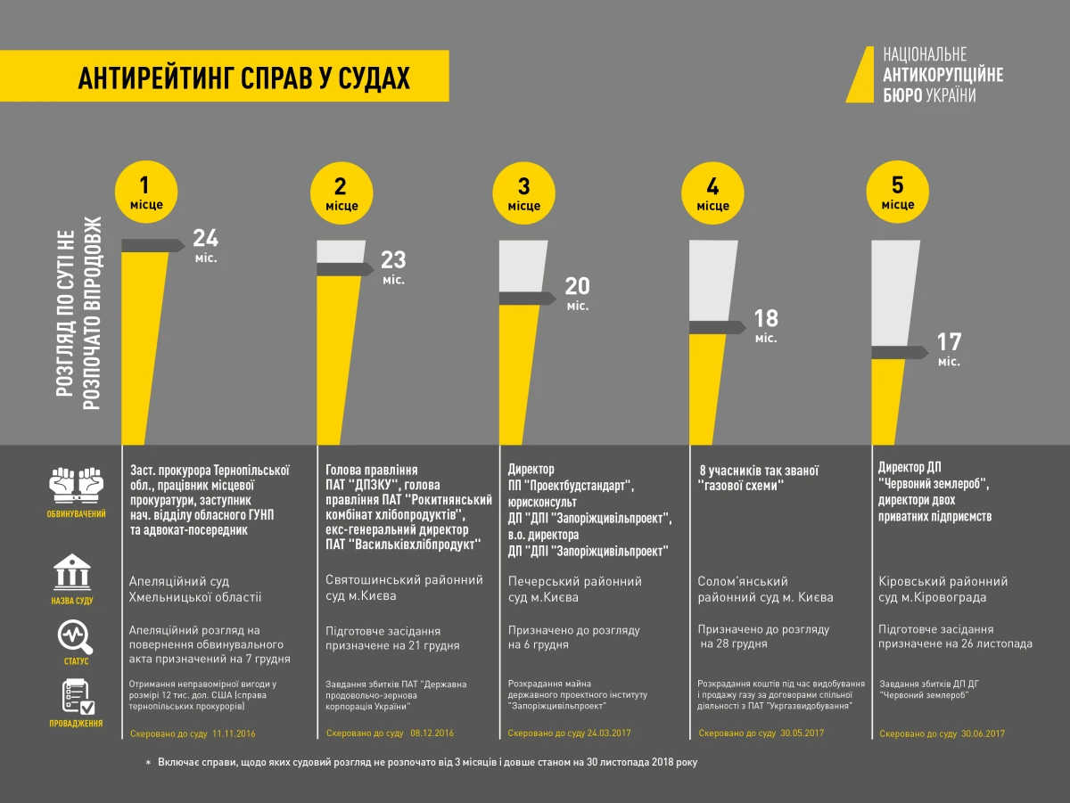 З-поміж 172 кримінальних проваджень, в яких станом на 30 листопада 2018 року детективи Національного антикорупційного бюро України завершили досудове розслідування, а прокурори Спеціалізованої антикорупційної прокуратури скерували обвинувальні акти до суду, підготовче засідання не відбулося у 49.