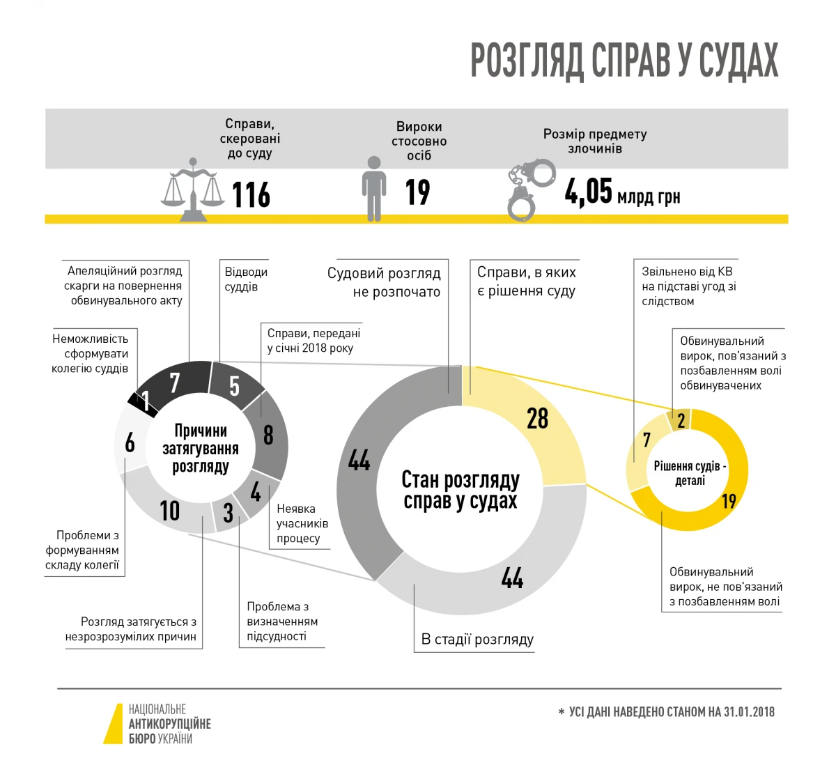 З-поміж 116 проваджень, в яких детективи Національного антикорупційного бюро України завершили досудове розслідування, а прокурори САП скерували обвинувальний акт до судових інстанцій, 44 справи залишаються без розгляду. При цьому, в деяких провадженнях підготовче засідання не може відбутися понад рік. Зокрема, у справі за фактом завдання збитків ПАТ «Державна продовольчо-зернова корпорація України» 29 січня 2018 року чергове підготовче засідання не відбулося у зв’язку з відводом суддів, а дата наступного засідання не визначена.
