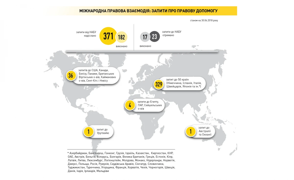 Для отримання інформації про кінцевих бенефіціарів таких структур та про рух коштів, виведених з України, НАБУ скеровує запити про міжнародну правову допомогу до компетентних органів інших держав. Від початку розслідувань Національне бюро надіслало до органів 61 держави 371 запит про міжнародну правову допомогу. 182 запити вже виконано.