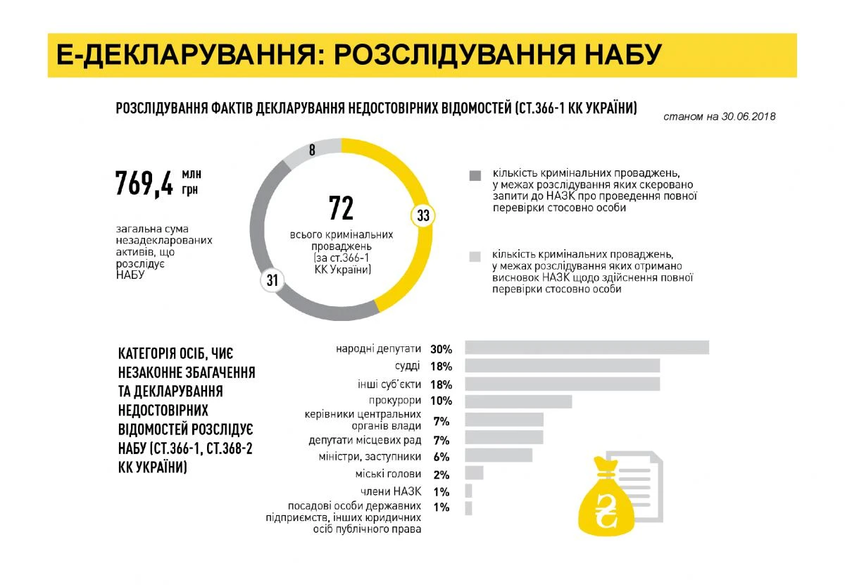 З 72 кримінальних провадженнях, в межах яких детективи НАБУ розслідують факти внесення недостовірних відомостей до декларацій осіб, уповноважених на виконання функцій держави або місцевого самоврядування, кожне друге стосується недекларування активів суддями або народними депутатами України. Такі дані оприлюднені у Звіті про діяльність НАБУ за І півріччя 2018 року.