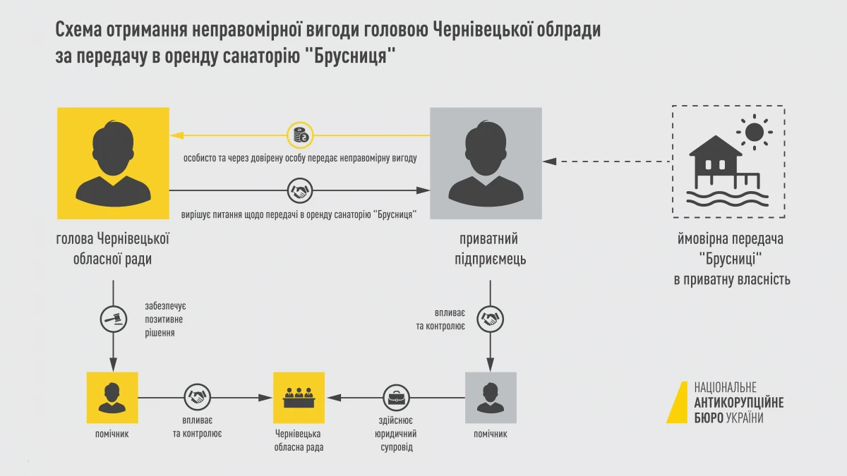 За даними слідства, голова Чернівецької обласної ради у липні 2019 року висловив прохання одному з підприємців Чернівецької області надати йому 400 тис. дол. США неправомірної вигоди за сприяння у передачі в оренду оздоровчого комплексу. Слідство задокументувало, що впродовж серпня-жовтня 2019 року голова Чернівецької облради одержав від підприємця частину коштів у розмірі 180 тис. дол. США.