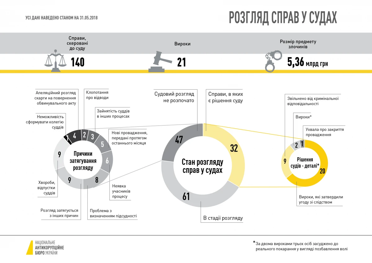 Загалом, лише у 32 справах від НАБУ і САП ухвалені судові рішення, однак більшість з них затверджують угоди про визнання винуватості з другорядними учасниками корупційних схем. Так, у травні винесено вирок стосовно заступника начальника управління – начальника відділу в Генеральній прокуратурі України, яким затверджено угоду. Рішення набуде чинності за місяць – 25 червня.