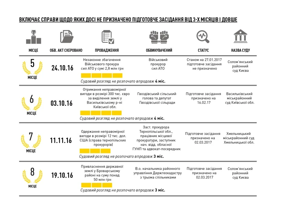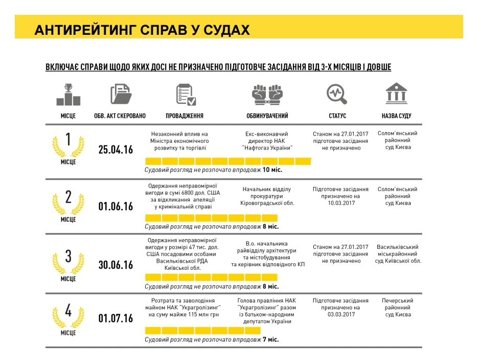 «За Законом підготовче засідання призначається упродовж 5 днів після одержання обвинувального акту. Ми склали «антирейтинг» справ, у яких воно досі не відбулося. Абсолютним чемпіоном в цьому плані є справа екс-виконавчого директора НАК «Нафтогаз» Андрія Пасішника. Обвинувальний акт було скеровано до суду ще наприкінці квітня 2016 року, але підготовче засідання не призначено й до сьогодні», – зазначив Директор НАБУ.