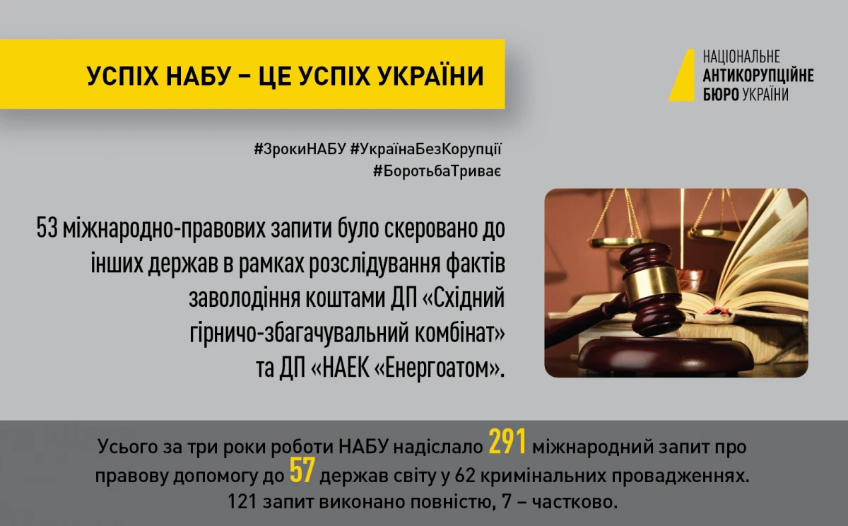 Зокрема, з моменту початку розслідувань юристи НАБУ скерували 291 міжнародний запит до 57 держав світу. Наразі 121 запит виконано повністю, 7 – частково. Завдяки отриманій від закордонних колег інформації слідство встановило причетність до корупційних схем, реалізованих на низці українських державних компаній, іноземних суб’єктів господарювання. Зокрема, йдеться про розслідування корупції на ПАТ «Укргазвидобування», ДП «Електроважмаш», ДП «Об’єднана гірничо-хімічна компанія» (ОГХК), ПАТ «Державна продовольчо-зернова корпорація України» (ДПЗКУ), ДП «Адміністрація морських портів України», ПАТ «Одеський припортовий завод» (ОПЗ) тощо. Для прикладу, у провадженні за фактами заволодіння коштами ДП «Східний гірничо-збагачувальний комбінат» у розмірі 17,28 млн дол. США та ДП «НАЕК «Енергоатом» — у розмірі 6,4 млн євро (завершене на початку 2018 року) було скеровано рекордну кількість запитів – 53.