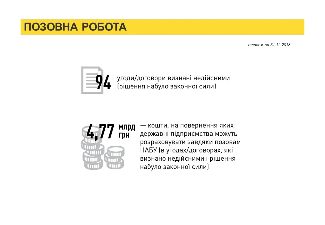 За словами Артема Ситника, завдяки позовній роботі НАБУ домоглося визнання недійсними 94 угод, укладених на державних підприємствах, на загальну суму понад 4,77 млрд грн. Це означає, що у державних компаній з’являються реальні підстави для повернення вкрадених у них ресурсів.