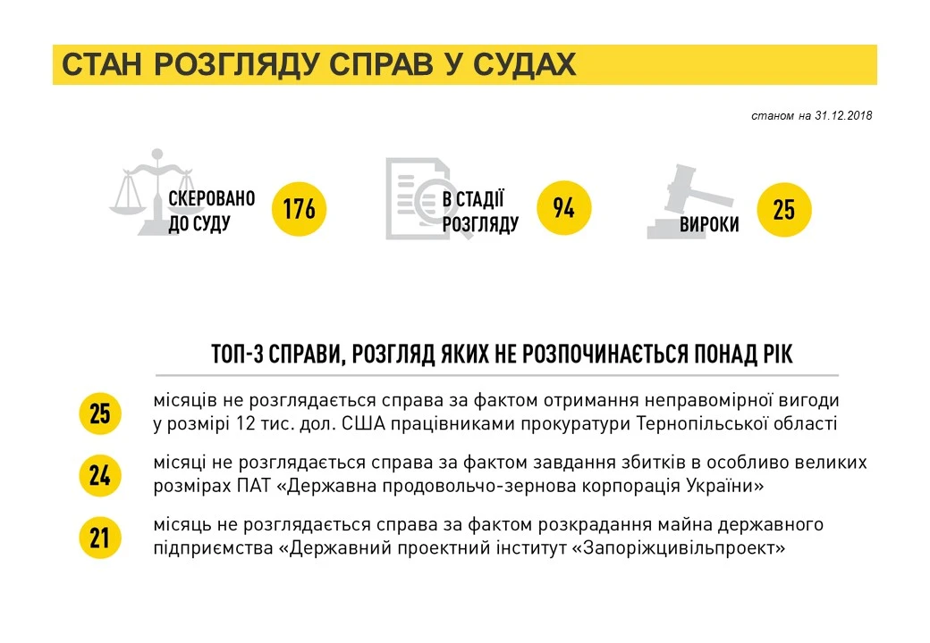 «У ІІ півріччі 2018 року про підозру повідомлено 44 особам, стосовно дій 61 особи розслідування завершено. Однак, як і раніше, збереглася негативна тенденція, коли справи передаються до суду, але там не розглядаються. Із 28 проваджень, скерованих до суду за минулі півроку, лише у восьми випадках судді розпочали розгляд по суті. Інші справи й досі перебувають на стадії підготовчого засідання», — зазначив Артем Ситник, презентуючи Звіт про діяльність інституції за ІІ півріччя 2018 року.