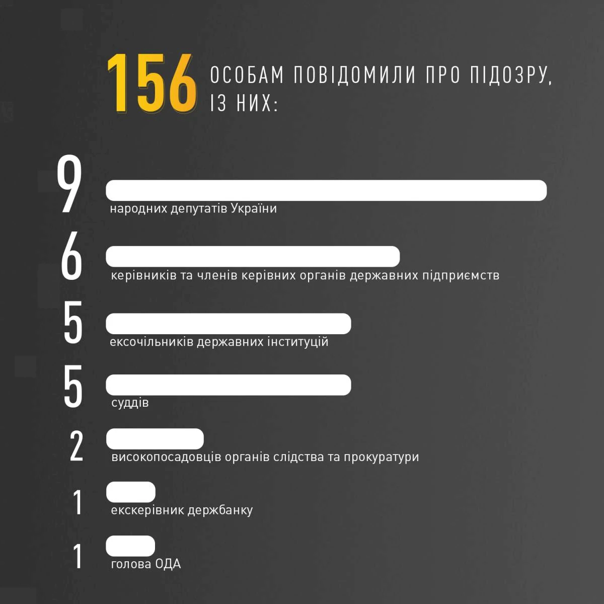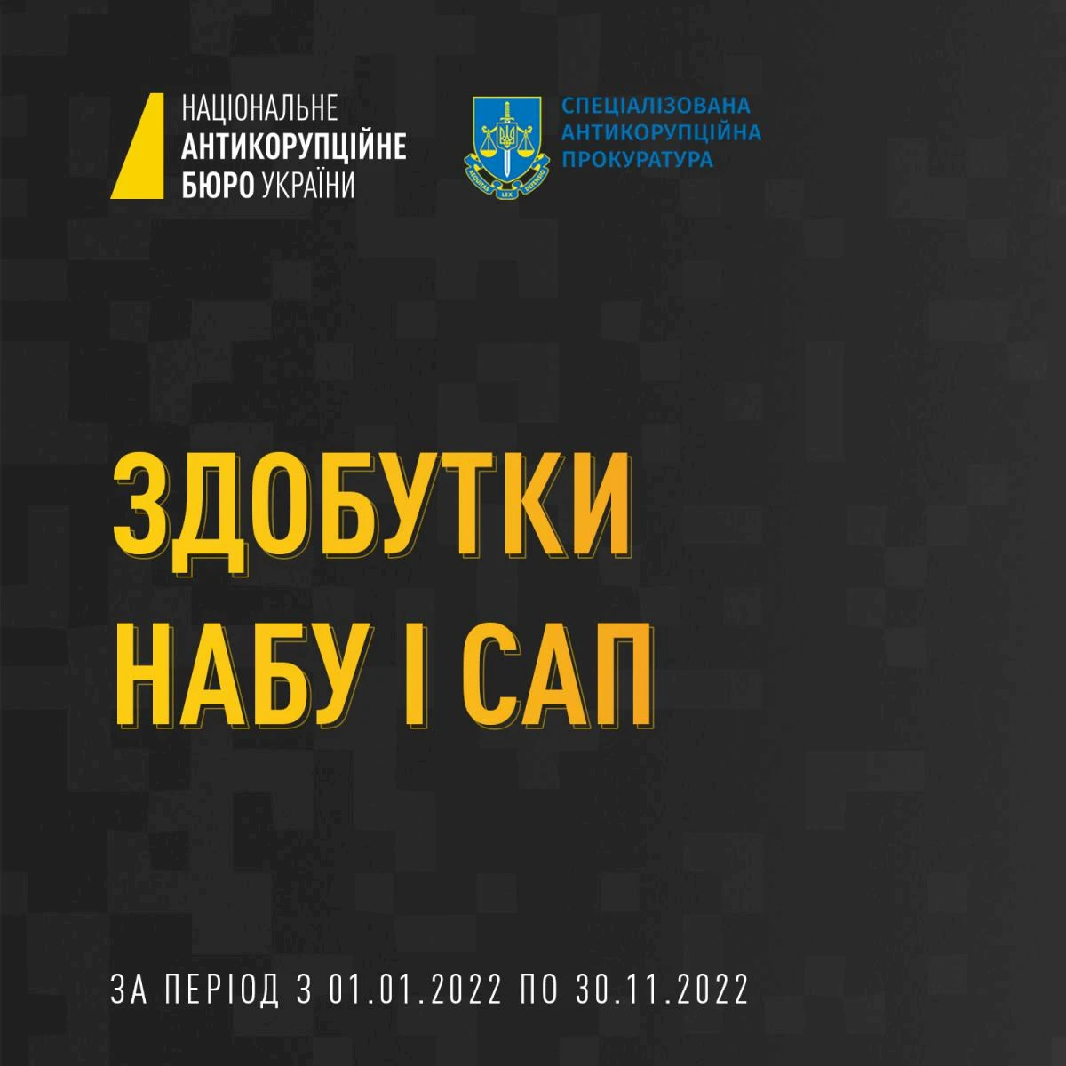За 11 місяців 2022 року (01.01.2022 – 30.11.2022) НАБУ та САП повідомили про підозру 156 особам, у тому числі 9 нардепам, 5 ексочільникам державних інституцій, 5 суддям, 6 керівникам та членам керівних органів державних підприємств, 2 високопосадовцям органів слідства та прокуратури, голові ОДА, екскерівнику держбанку.