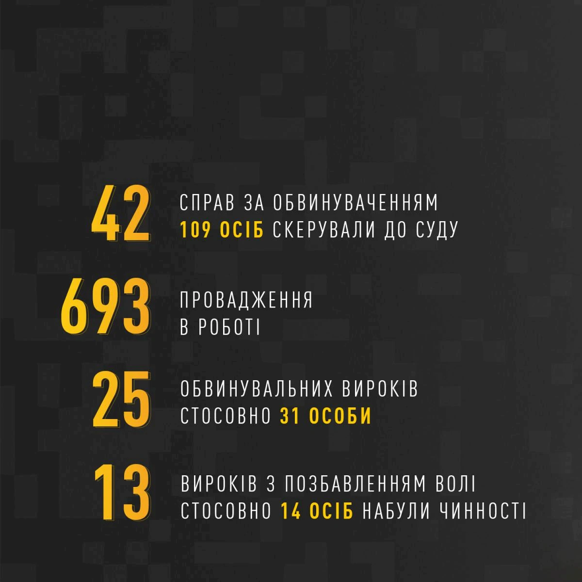 До суду скерували 40 справ за обвинуваченням 105 осіб. Суддями ВАКС ухвалено 21 вирок з позбавлення волі стосовно 29 осіб, 13 таких вироків стосовно 14 осіб набули чинності.