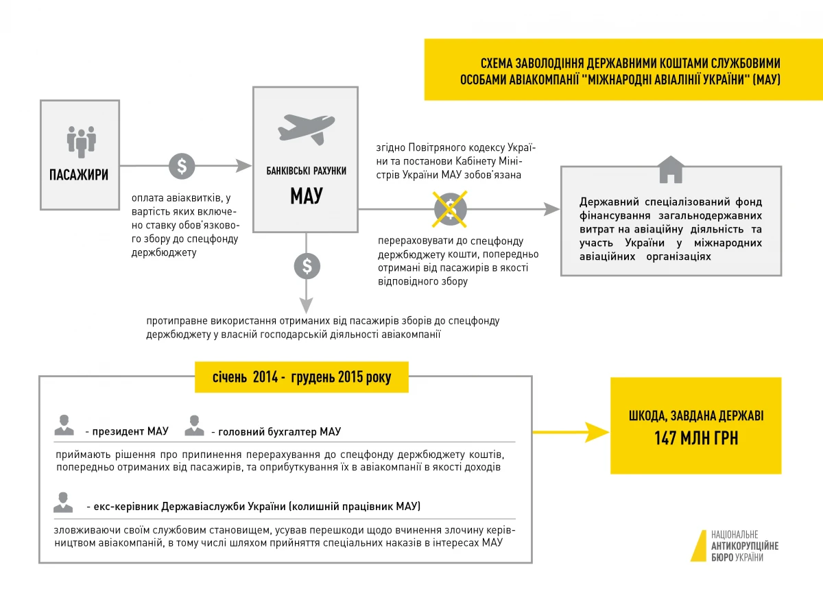 Досудовим розслідуванням встановлено, що впродовж 2014-2015 років керівництво МАУ за сприяння службових осіб Державіаслужби України протиправно заволоділо коштами Державного спеціалізованого фонду фінансування загальнодержавних витрат на авіаційну діяльність та участь України у міжнародних авіаційних організаціях (далі – Фонд) в особливо великих розмірах.