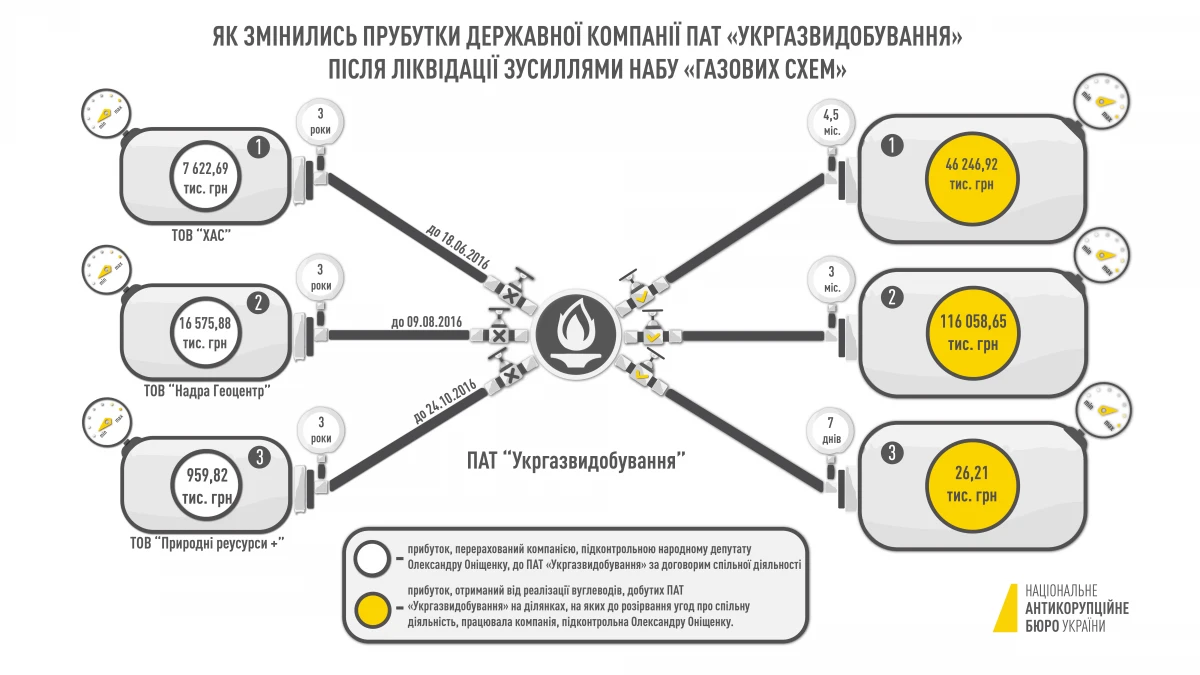 Кошти на рахунки державного підприємства почали активно надходити після ухвалення судом рішень про розірвання зазначених угод між державною компанією і підприємствами, підконтрольними Онищенку: ТОВ «Надра Геоцентр», ТОВ «Фірма «ХАС» та ТОВ «Природні ресурси +». Майже трирічна співпраця цих структур із ПАТ «Укргазвидобування» забезпечила останнє всього 25,158 млн грн прибутку.