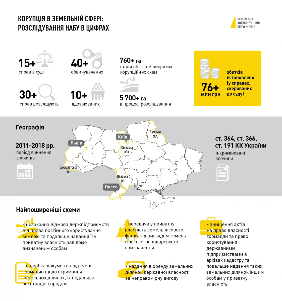 Злочини з землею, слідство у яких веде НАБУ, вчинялися у 2011-2020 роках на території таких областей як Одеська, Київська, Закарпатська, Сумська, а також у великих містах України, як-от: Київ, Львів, Одеса. Площа найбільшої земельної ділянки, розкрадання якої розслідують детективи — понад 2 000 га. А загальна площа земель, махінації з яким розслідуються — перевищує 5 700 га.