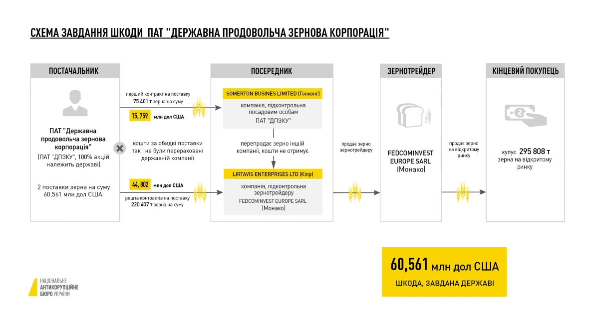 Під час розслідування детективи Бюро викрили схему (див. «Схема завдання шкоди ПАТ «ДПЗКУ»), відповідно до якої зерно, що належало ДПЗКУ, продавалось за заниженими цінами одному з міжнародних зернотрейдерів через низку приватних компаній-посередників, підконтрольних службовим особам ДПЗКУ та міжнародному зернотрейдеру.