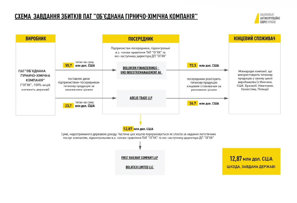 Детективи НАБУ встановили, що сировина, видобута на потужностях ДП «Об’єднана гірничо-хімічна компанія» (йдеться про ільменітовий, рутиловий, цирконовий та дистен-саліманітовий концентрати), постачалась за кордон через компанії-посередники, підконтрольні або пов’язані зі службовими особами цього держпідприємства. Сировина продавалась цим компаніям за заниженими цінами, а ті, в свою чергу, реалізовували її за ринковою ціною кінцевим споживачам у різних регіонах світу. Оскільки посередники були резидентами інших країн (Австрії та Великої Британії), прибутки від продажу залишалися за кордоном.