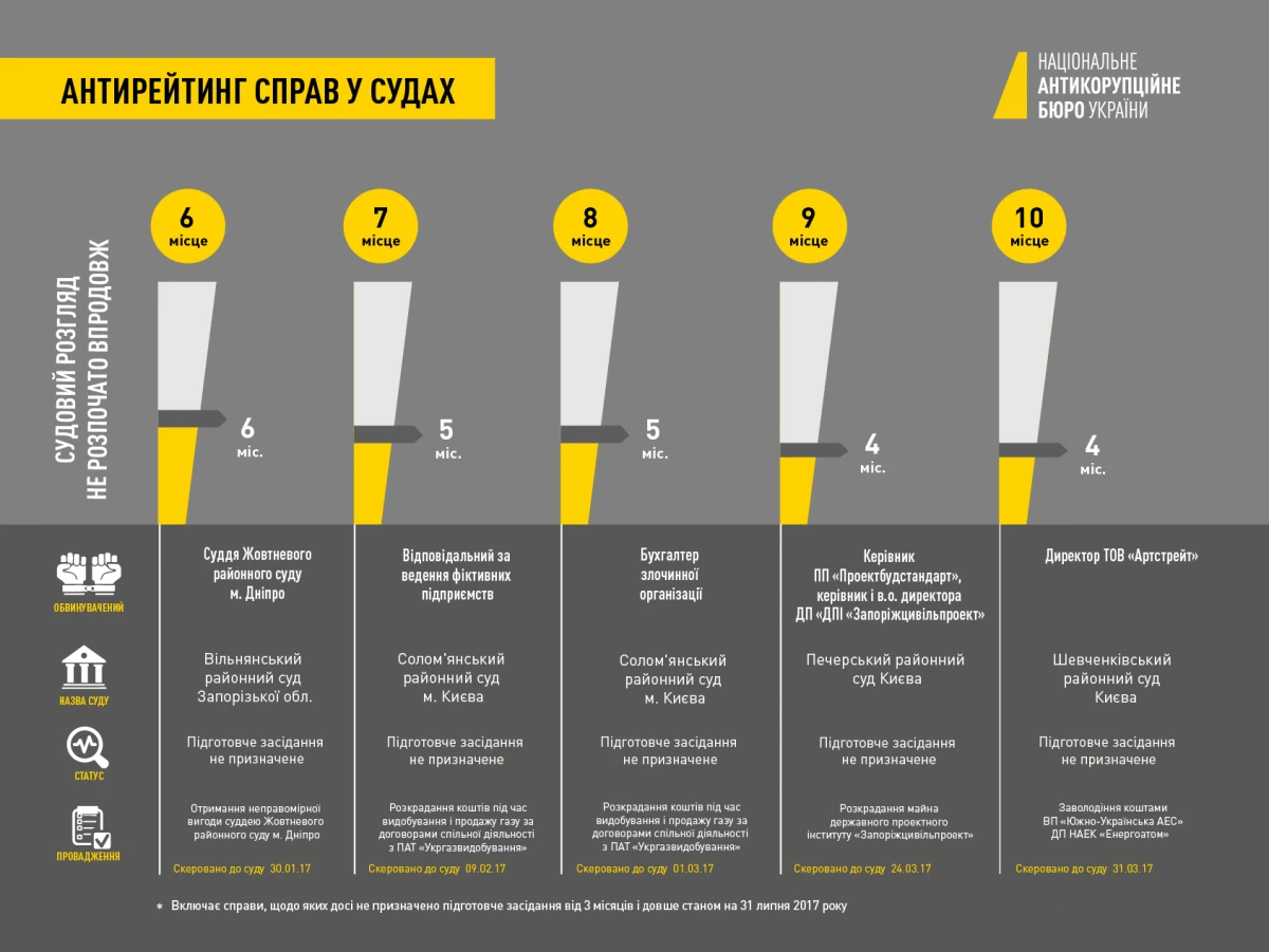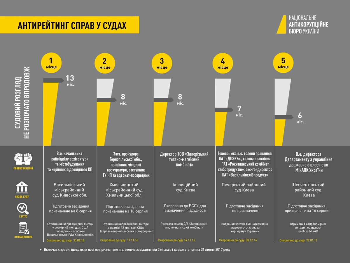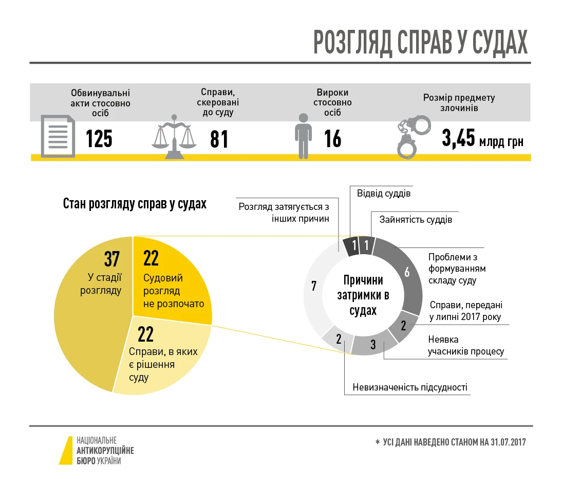 Зважаючи на досить повільний розгляд справ, Бюро продовжує наголошує на необхідності якнайшвидшого створення в Україні Спеціалізованого антикорупційного суду, який поставить «крапку» у справах від НАБУ та САП.