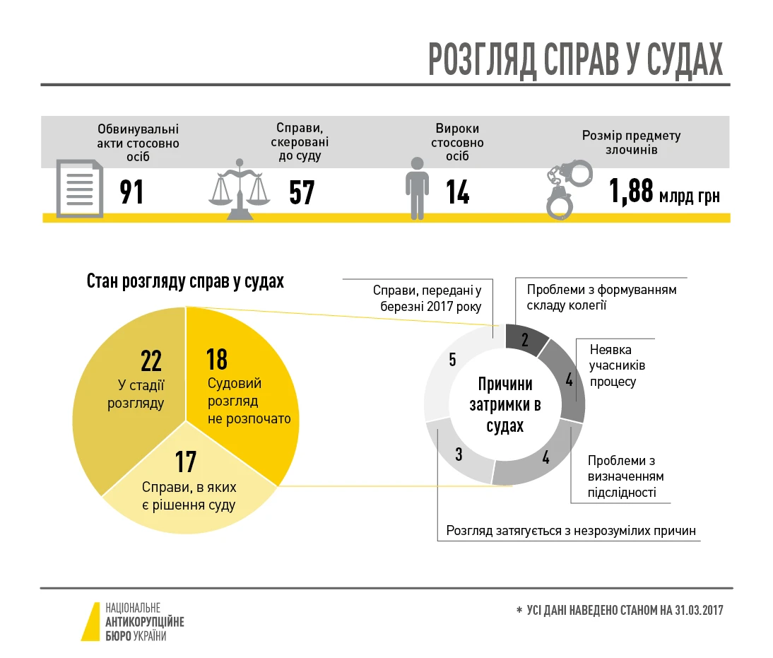 Серед 57 справ, які Національне антикорупційне бюро України та Спеціалізована антикорупційна прокуратура скерували до суду, служителі Феміди за понад рік винесли рішення лише у 17, у 18 справах судовий розгляд так і не розпочато. Причини «затримки» з розглядом різні: об’єктивний брак суддів, їх лікарняні та відпустки, періодичні перенесення засідань через неявку учасників процесу тощо.