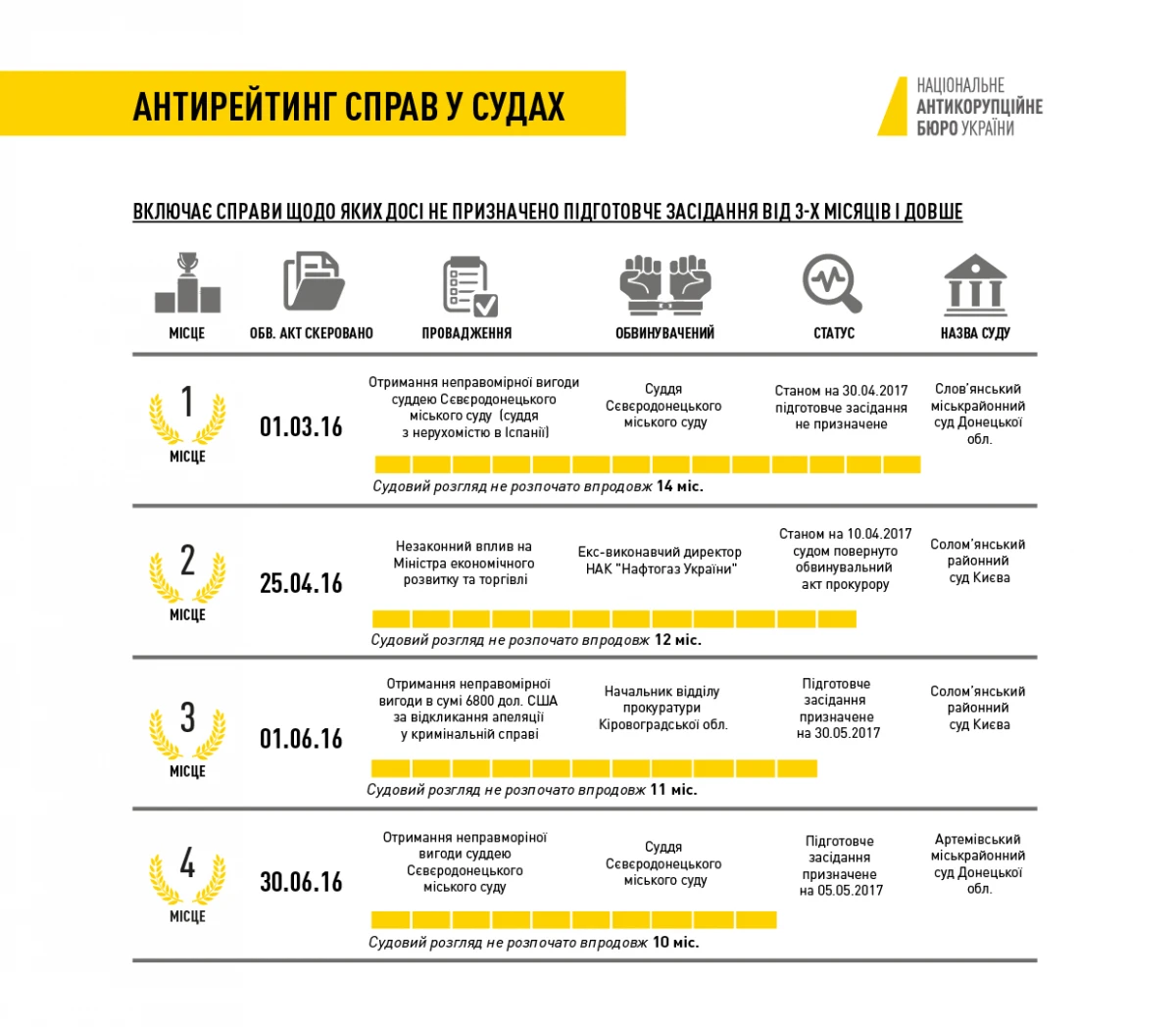 Всі рекорди б’є справа про отримання неправомірної вигоди суддею Сєвєродонецького міського суду (відома як суддя з нерухомістю в Іспанії) – судовий розгляд не розпочато впродовж 14 місяців. 12 місяців у суді безрезультатно знаходиться справа про незаконний вплив на міністра економічного розвитку та торгівлі, впродовж 11 місяців — справа про отримання неправомірної вигоди начальницею відділу прокуратури Кіровоградської області.