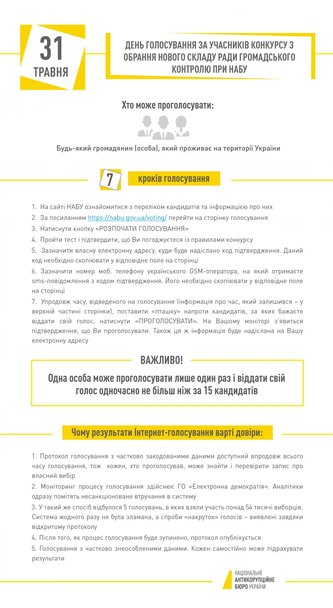 31 травня о 9:00 розпочалося відкрите рейтингове інтернет-голосування за осіб, які виявили бажання працювати у складі Ради громадського контролю при Національному антикорупційному бюро України. Голосування триватиме впродовж усього дня – з 9:00 до 21:00. Віддавати голоси за представників громадських об’єднань (далі – ГО) можуть усі громадяни, які проживають на території України. Одна особа має право обрати до 15 кандидатур з-поміж 56-ти претендентів від 35 ГО. Закликаємо громадськість долучатися до виборів за посиланням: https://nabu.gov.ua/voting/.