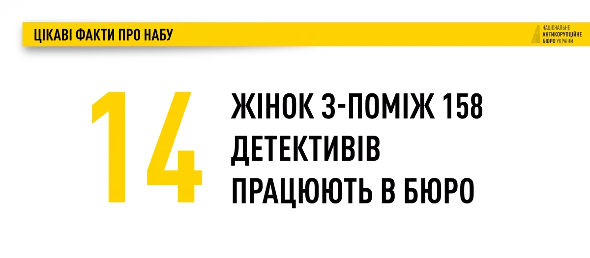 Ключовою в НАБУ є посада детектива, яка поєднує функції оперативного працівника та слідчого. На сьогодні у підрозділах Бюро працюють 158 детективів, серед яких – 14 жінок. 27 детективів НАБУ раніше не працювали у правоохоронних органах або на державній службі.