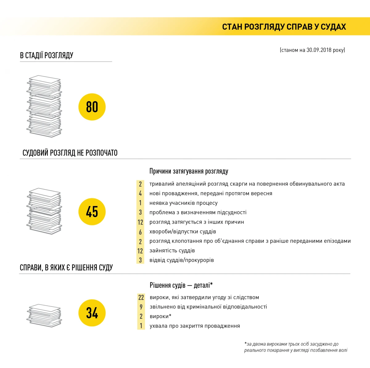 Станом на 30.09.2018 у 45 зі 159 кримінальних проваджень, в яких детективи Національного бюро здійснювали досудове розслідування, а прокурори САП скерували обвинувальний акт до судових інстанцій, не відбулося підготовчого засідання. Судові рішення є у 34 справах, при цьому лише трьох осіб вироком суду засуджено до покарання у вигляді позбавлення волі.