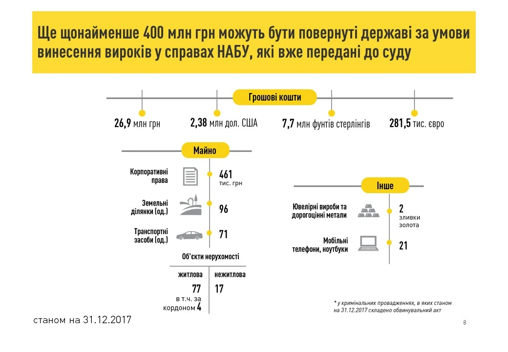 Завдяки роботі детективів НАБУ та прокурорів САП державі вже повернуто понад 250 млн грн. Із цієї суми 174 млн грн відшкодовано у 2017 році. Крім того, правоохоронним органам вдалося попередити розкрадання майже двох млрд грн. Для усунення передумов вчинення корупційних злочинів юристи Національного бюро подали 35 позовів до суду про визнання недійсними кабальних для держави угод на загальну суму понад 6 млрд грн. Внаслідок цього понад 130 млн грн вже стягнуто на користь держави.