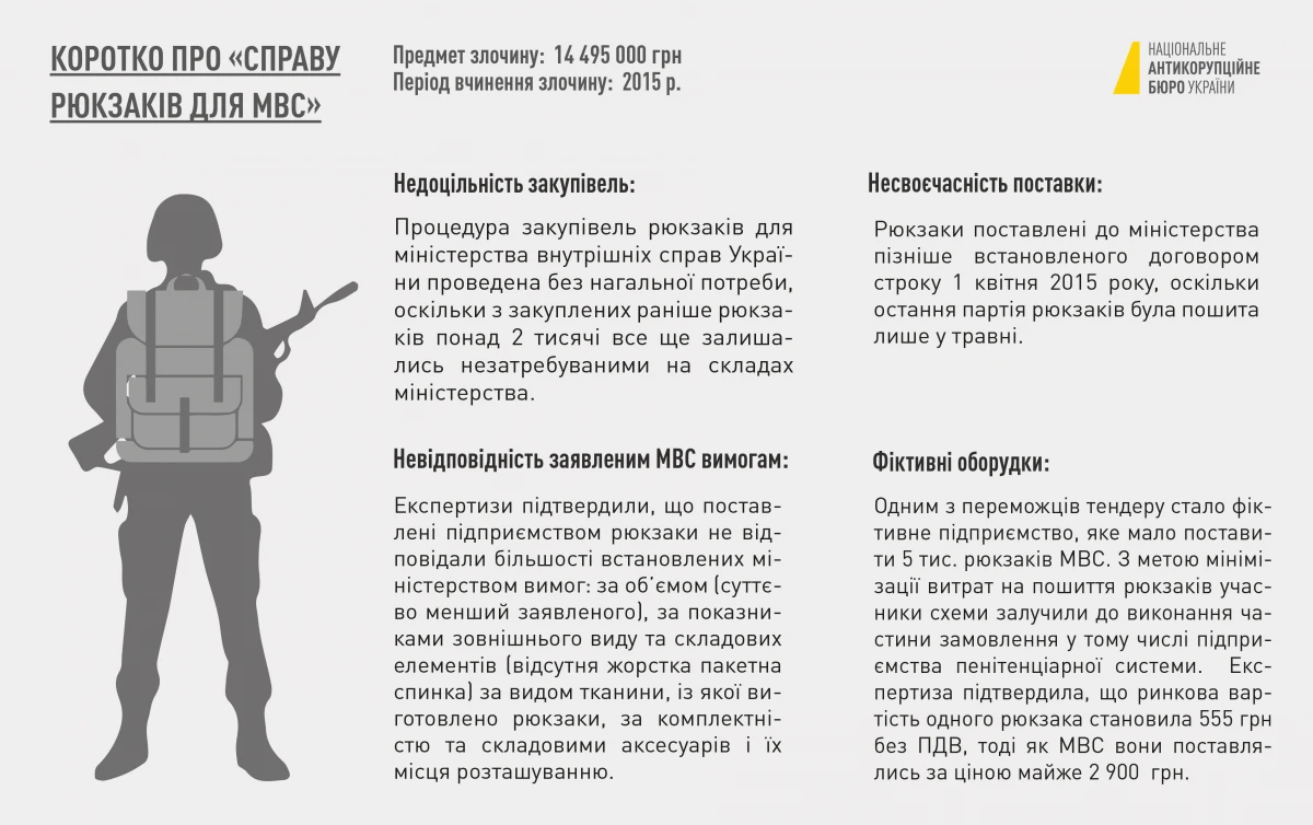 У ході засідання профільного комітету Артем Ситник також повідомив деталі корупційної схеми під час закупівлі рюкзаків для потреб Міністерства внутрішніх справ України, що завдала державі понад 14,5 млн грн збитків. Так, за версію слідства, озвученої директором, восени 2014 року приватна особа А., користуючись особистими стосунками із заступником Міністра внутрішніх справ, виступила організатором закупівлі рюкзаків для потреб солдатів Національної гвардії. Це при тому, що у той момент на складах МВС вже знаходилося 2000 невикористаних рюкзаків. Організатор домовився про виготовлення рюкзаків з підприємцем Л., який, у свою чергу, знайшов ТОВ з ознаками фіктивності для участі у переговорній процедурі закупівлі з МВС. Завдяки зв’язкам підозрюваного А. ця ТОВ отримала контракт на постачання 5000 рюкзаків за ціною 2899 грн за одиницю. До контракту додавався перелік вимог до рюкзаків щодо розміру, тканини, кишень, клапанів, ортопедичних властивостей тощо. ТОВ, яка отримала контракт, по факту існувала лише для обміну документами. Насправді рюкзаки шили у кустарний спосіб декілька приватних підприємців, а також підприємства пенітенціарної системи. У березні-травні 2015 року приватний підприємець Л. фактично поставив до МВС 5000 рюкзаків, які за документами нібито надійшли від ТОВ. МВС прийняло рюкзаки і сплатило ТОВ майже 14,5 мільйонів гривень, які згодом через низку фіктивних підприємств були конвертовані у готівку. В результаті МВС із запізненням отримало неякісну продукцію, яка не відповідає вимогам, встановленим самим Міністерством, витративши при цьому 14,5 млн грн бюджетних коштів.