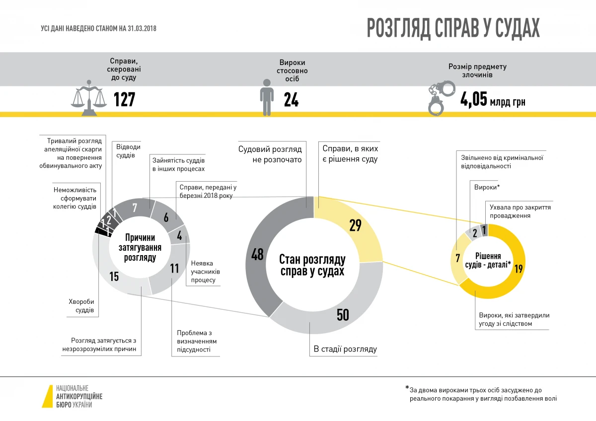 Загалом, наразі лише у 29 справах від НАБУ і САП ухвалені судові рішення. Більшість судових рішень – це затвердження угод про визнання винуватості з другорядними учасниками корупційних схем. Так, у 19 справах ухвалено обвинувальний вирок, не пов’язаний з позбавленням волі. Станом на 31 березня 2018 року у двох справах до реального покарання у вигляді позбавлення волі засуджено трьох осіб.
