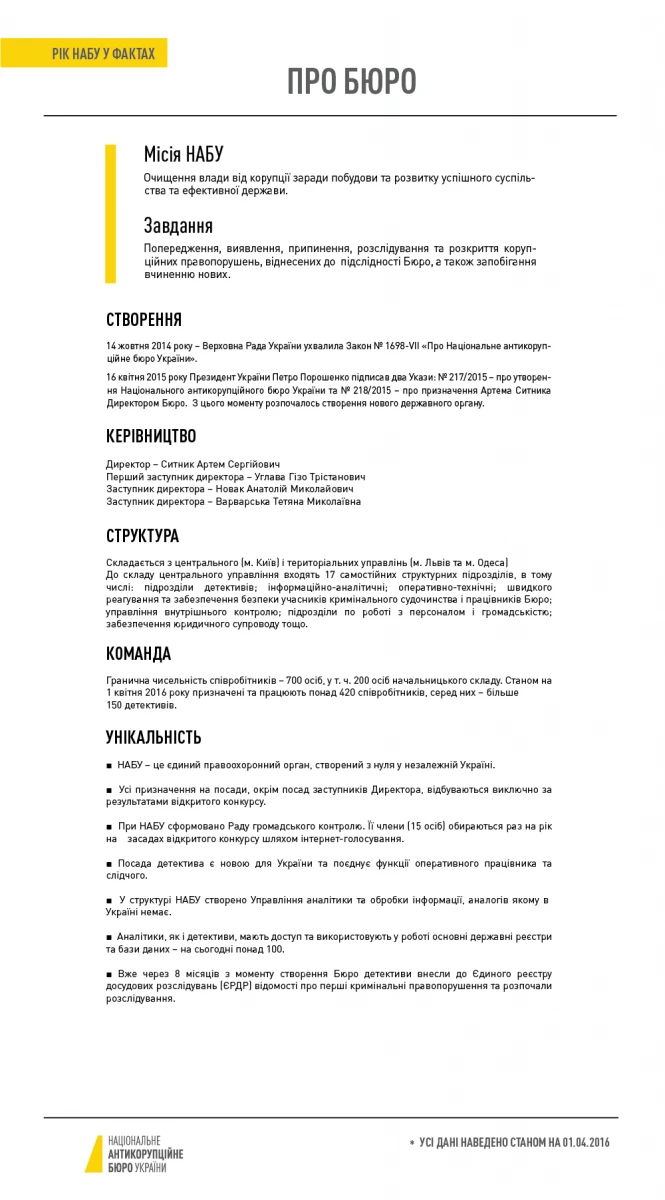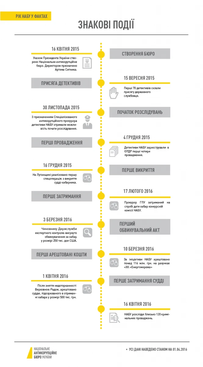 До річниці створення НАБУ (16 квітня) нагадуємо основні етапи формування Бюро та звітуємо про результати нашої роботи.