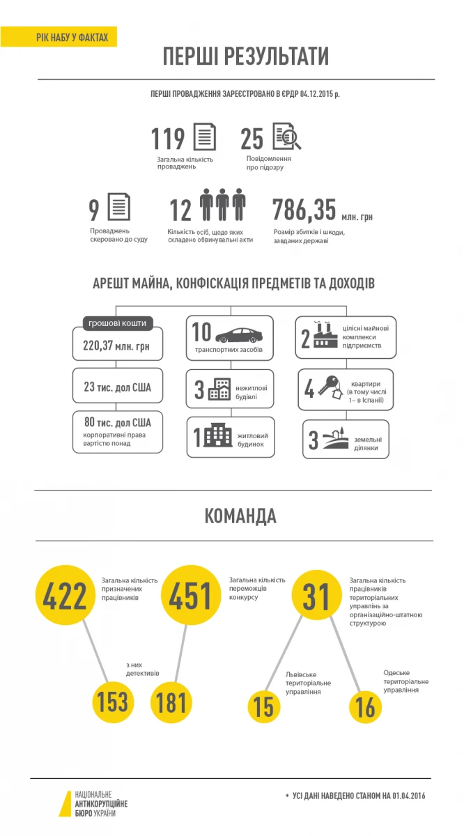Близько 120 кримінальних проваджень, 9 справ у суді щодо 12 фігурантів, 25 повідомлень про підозру та понад 220 мільйонів гривень арештованих коштів – це лише деякі з перших результатів роботи Національного антикорупційного бюро України за рік.