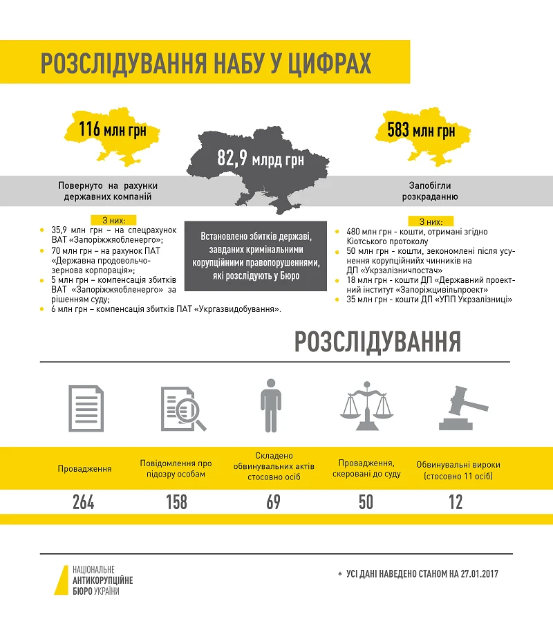 Детективи Національного антикорупційного бюро України під процесуальним керівництвом прокурорів Спеціалізованої антикорупційної прокуратури здійснюють розслідування у 264 кримінальних провадженнях, сукупний розмір предмету злочину у яких становить 82,9 млрд грн. Вказана сума перевищує граничний обсяг дефіциту Державного бюджету України на 2017 рік. Про це повідомив Директор НАБУ Артем Ситник 10 лютого під час презентації Звіту про результати роботи Бюро за останні півроку.