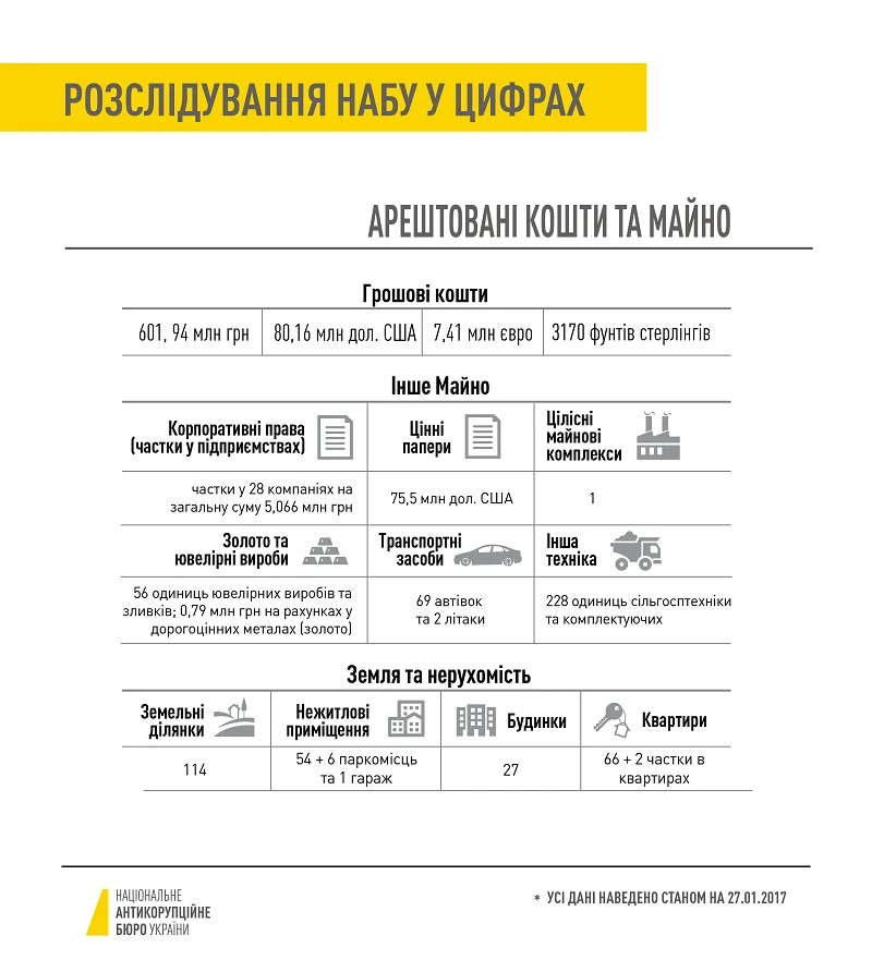 За словами Директора НАБУ, в процесі досудових розслідувань Бюро заарештовано грошові кошти в сумі 601,94 млн грн, 80,16 млн дол. США, 7,41 млн євро, 3170 фунтів стерлінгів, а також низку рухомого і нерухомого майна осіб, причетних до корупційних злочинів. «Причиною того, що ці кошти досі не повернуті на рахунки держави, є відсутність судових вироків», — зазначив Артем Ситник.