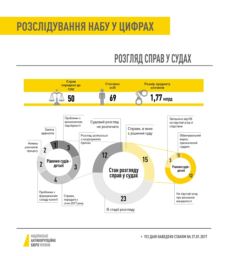 Як повідомив Директор Бюро, станом на кінець січня НАБУ завершило досудове розслідування у 50 провадженнях. Лише щодо 15 з них є рішення суду, 23 перебувають на стадії судового розгляду, а у 12 — розгляд досі не розпочався. «За такої вкрай неефективної роботи судів на вироки у резонансних справах доведеться чекати роками. Тому ми наголошуємо на необхідності створення Антикорупційного суду», — заявив Артем Ситник.