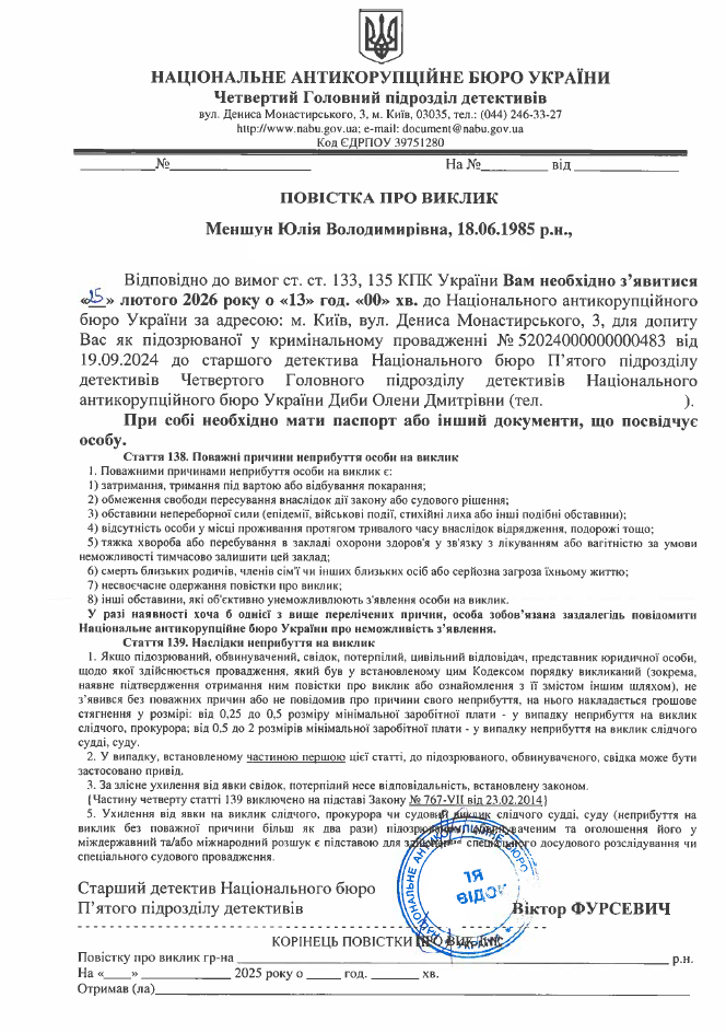 Згідно з вимогами ст. 133, 135 КПК України Ви, Меншун Юлія Володимирівна, викликаєтеся 25 лютого 2026 року о 13.00 до старшого детектива Національного бюро П'ятого підрозділу детективів Четвертого Головного підрозділу детективів Диби Олени Дмитрівни за адресою: м. Київ, вул. Дениса Монастирського, 3, для допиту Вас як підозрюваної у кримінальному провадженні № 52024000000000483 від 19.09.2024.