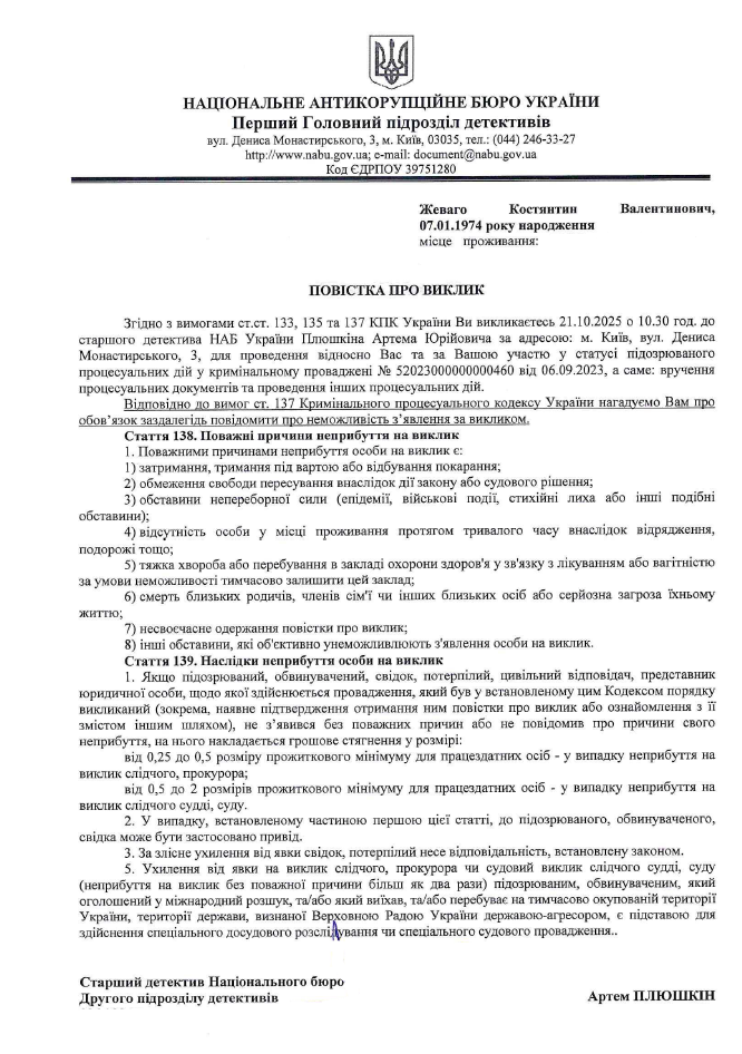 Згідно з вимогами ст.ст. 133, 135 та 137 КПК України Ви, ЖЕВАГО Костянтин Валентинович, викликаєтесь 21.10.2025 о 10.30 год. до старшого детектива НАБ України ПЛЮШКІНА Артема Юрійовича за адресою: м. Київ, вул. Дениса Монастирського, 3, для проведення відносно Вас та за Вашою участю у статусі підозрюваного процесуальних дій у кримінальному проваджені № 52023000000000460 від 06.09.2023, а саме: вручення процесуальних документів та проведення інших процесуальних дій.