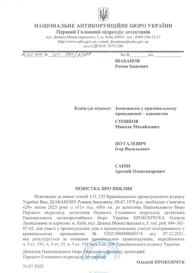 Відповідно до вимог статей 133, 135 Кримінального процесуального кодексу України Вам, ШАБАНОВУ Роману Івановичу, 08.07.1978 р.н., необхідно з'явитися «29» липня 2025 року о «11» год. «00» хв. до детектива Національного бюро Першого підрозділу детективів Першого Головного підрозділу детективів Національного антикорупційного бюро України ПРОКОПЧУКА Олексія Леонідовича за адресою: м. Київ, вул. Дениса Монастирського, 3, тел. роб. 044-363- 97-65, для участі у процесуальних діях в процесуальному статусі підозрюваного у кримінальному провадженні № 52021000000000574 від 07.12.2021, яке розслідується за ознаками кримінальних правопорушень, передбачених ч. 5 ст. 191, ч. 3 ст. 15, ч. 5 ст. 191 та ч 2 ет. 209 Кримінального кодексу України.