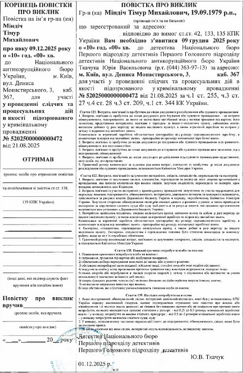 Згідно з вимогами ст. 133, 135 та 137 КПК України Ви, Міндіч Тімур Михайлович, викликаєтесь 09 грудня 2025 року о 10.00 годині до детектива Національного бюро Першого підрозділу детективів Першого Головного підрозділу детективів Національного антикорупційного бюро України Ткачука Юрія Васильовича за адресою: м. Київ, вул. Дениса Монастирського, 3, для проведення відносно Вас та за Вашою участю у статусі підозрюваного процесуальних дій у кримінальному проваджені № 52025000000000472 від 21.08.2025, а саме: вручення процесуальних документів та проведення інших процесуальних дій.