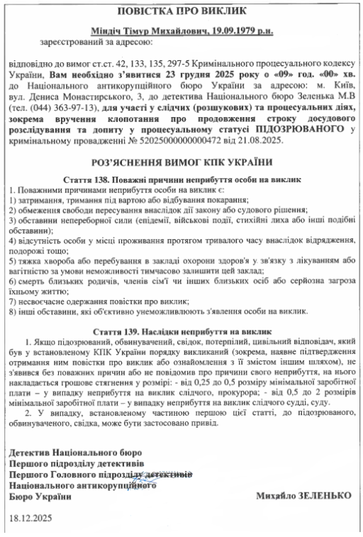 Згідно з вимогами ст. 133, 135 та 137 КПК України Ви, Міндіч Тімур Михайлович, викликаєтесь 23 грудня 2025 року о 09.00 годині до детектива Національного антикорупційного бюро України Зеленька М.В. за адресою: м. Київ, вул. Дениса Монастирського, 3, для проведення відносно Вас та за Вашою участю у статусі підозрюваного процесуальних дій у кримінальному проваджені № 52025000000000472 від 21.08.2025, а саме: вручення процесуальних документів та проведення інших процесуальних дій.