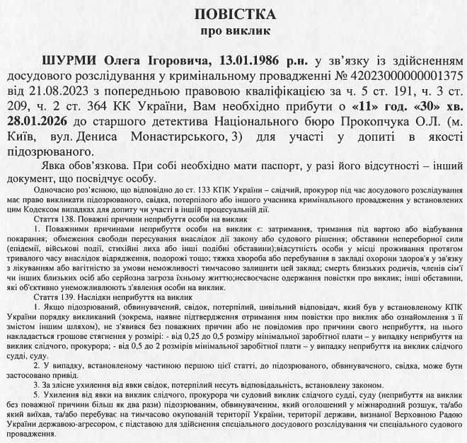 Згідно з вимогами ст. 133, 135 та 137 КПК України Ви, ШУРМА Олег Ігорович, викликаєтесь 28 січня 2026 року об 11 годині 30 хвилин до детектива Національного бюро Першого підрозділу детективів Першого Головного підрозділу детективів ПРОКОПЧУКА Олексія Леонідовича за адресою: м. Київ, вул. Дениса Монастирського, 3, для проведення відносно Вас та за Вашою участю у статусі підозрюваного процесуальних дій у кримінальному проваджені № 42023000000001375 від 21.08.2025, а саме: вручення процесуальних документів та проведення інших процесуальних дій.