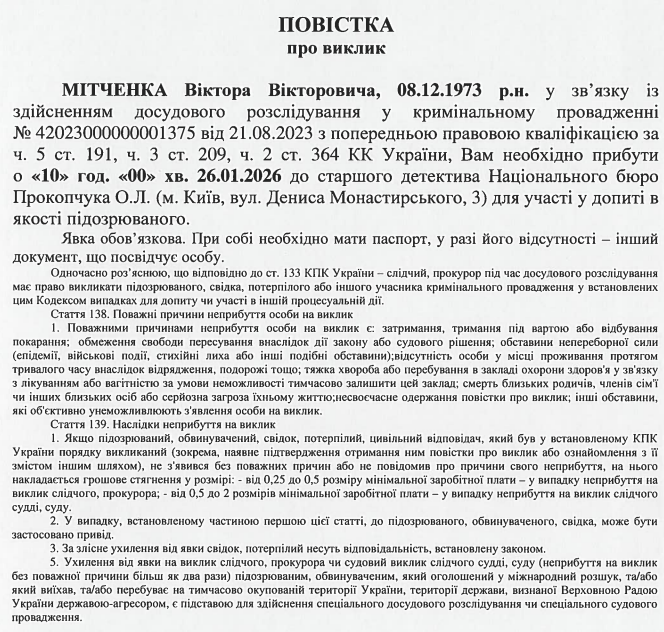 Згідно з вимогами ст. 133, 135 та 137 КПК України Ви, МІТЧЕНКО Віктор Вікторович, викликаєтесь 26 січня 2026 року о 10.00 до детектива Національного бюро Першого підрозділу детективів Першого Головного підрозділу детективів ПРОКОПЧУКА Олексія Леонідовича за адресою: м. Київ, вул. Дениса Монастирського, 3, для проведення відносно Вас та за Вашою участю у статусі підозрюваного процесуальних дій у кримінальному проваджені № 42023000000001375 від 21.08.2025, а саме: вручення процесуальних документів та проведення інших процесуальних дій.