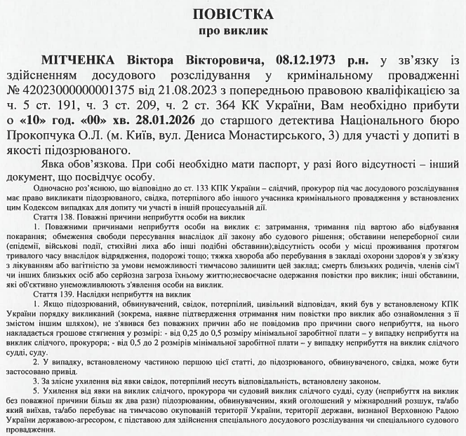 Згідно з вимогами ст. 133, 135 та 137 КПК України Ви, МІТЧЕНКО Віктор Вікторович, викликаєтесь 28 січня 2026 року о 10.00 до детектива Національного бюро Першого підрозділу детективів Першого Головного підрозділу детективів ПРОКОПЧУКА Олексія Леонідовича за адресою: м. Київ, вул. Дениса Монастирського, 3, для проведення відносно Вас та за Вашою участю у статусі підозрюваного процесуальних дій у кримінальному проваджені № 42023000000001375 від 21.08.2025, а саме: вручення процесуальних документів та проведення інших процесуальних дій.