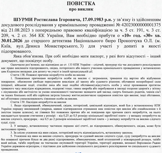 Згідно з вимогами ст. 133, 135 та 137 КПК України Ви, ШУРМА Ростислав Ігорович, викликаєтесь 30 січня 2026 року о 10 годині 30 хвилин до детектива Національного бюро Першого підрозділу детективів Першого Головного підрозділу детективів ПРОКОПЧУКА Олексія Леонідовича за адресою: м. Київ, вул. Дениса Монастирського, 3, для проведення відносно Вас та за Вашою участю у статусі підозрюваного процесуальних дій у кримінальному проваджені № 42023000000001375 від 21.08.2025, а саме: вручення процесуальних документів та проведення інших процесуальних дій.