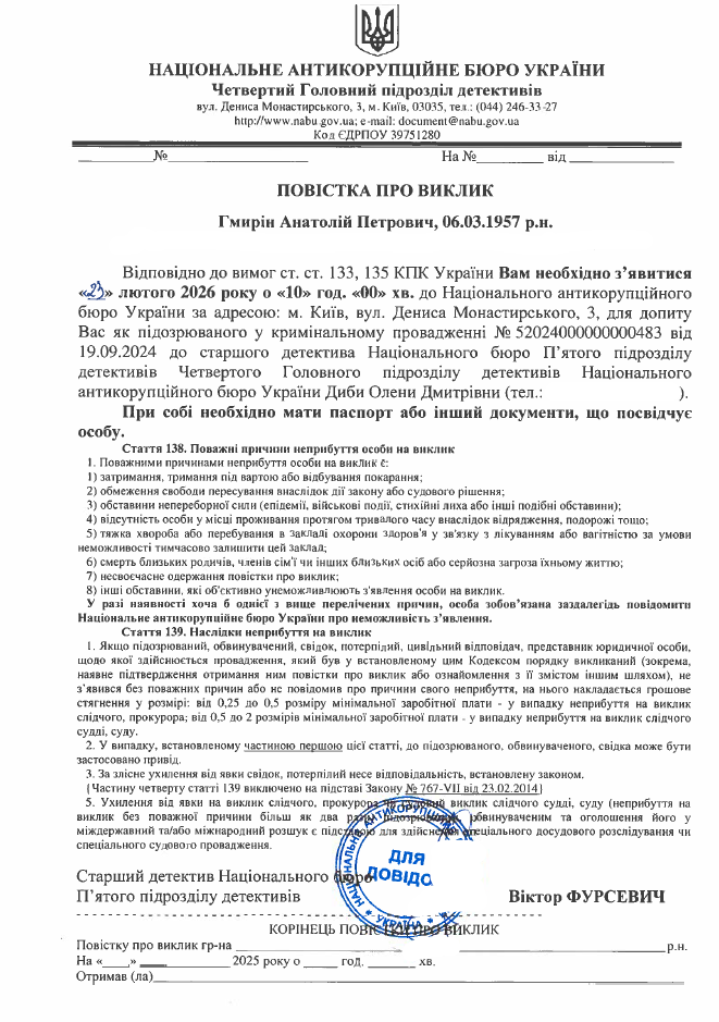 Згідно з вимогами ст. 133, 135 КПК України Ви, Гмирін Анатолій Петрович, викликаєтеся 23 лютого 2026 року о 10.00 до старшого детектива Національного бюро П'ятого підрозділу детективів Четвертого Головного підрозділу детективів Диби Олени Дмитрівни за адресою: м. Київ, вул. Дениса Монастирського, 3, для допиту Вас як підозрюваного у кримінальному провадженні № 52024000000000483 від 19.09.2024.