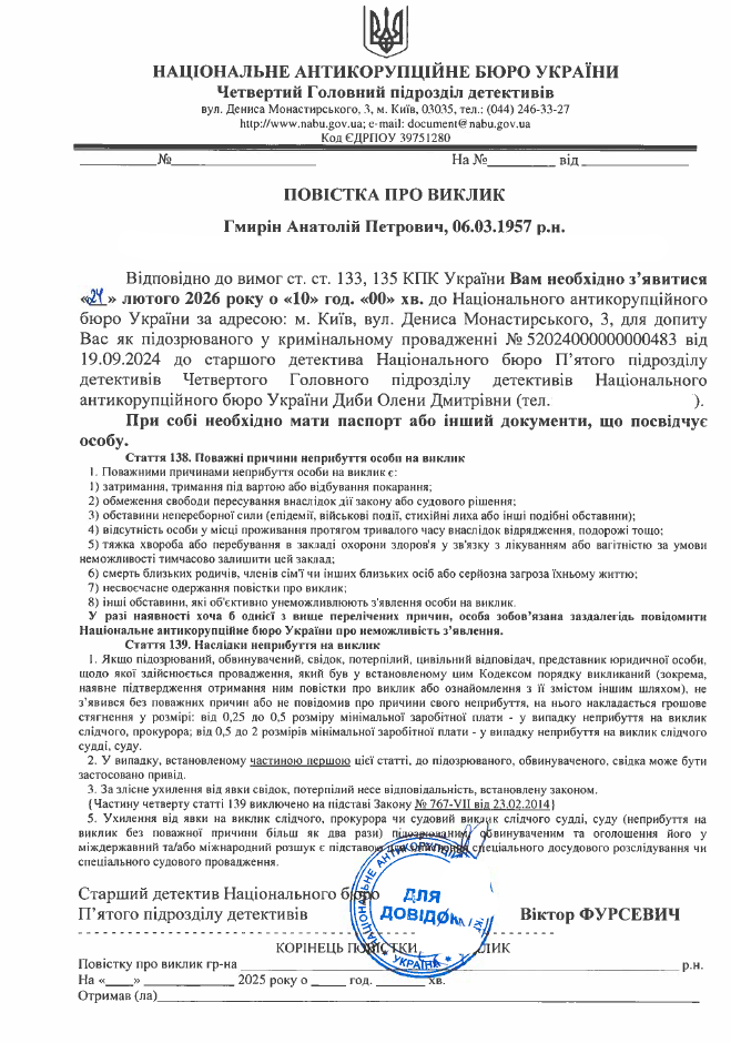Згідно з вимогами ст. 133, 135 КПК України Ви, Гмирін Анатолій Петрович, викликаєтеся 24 лютого 2026 року о 10.00 до старшого детектива Національного бюро П'ятого підрозділу детективів Четвертого Головного підрозділу детективів Диби Олени Дмитрівни за адресою: м. Київ, вул. Дениса Монастирського, 3, для допиту Вас як підозрюваного у кримінальному провадженні № 52024000000000483 від 19.09.2024.